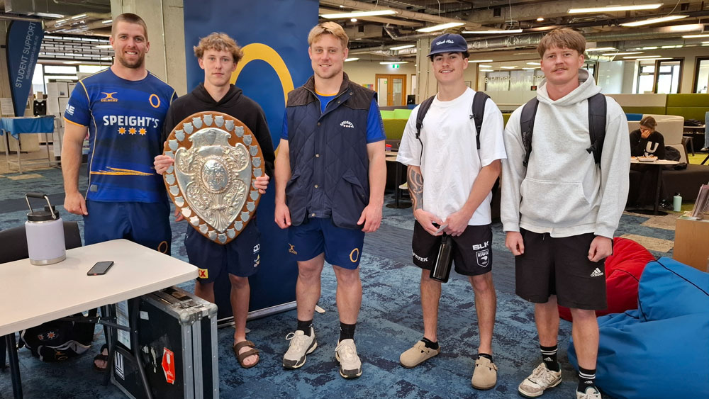 Charles Elton and Henry Bell from Otago Rugby's NPC squad visited The Hub at Otago Polytechnic this afternoon, showing off the Ranfurly Shield and giving ākonga the chance to snap a few photos and grab discounted student tickets for the semi-final.