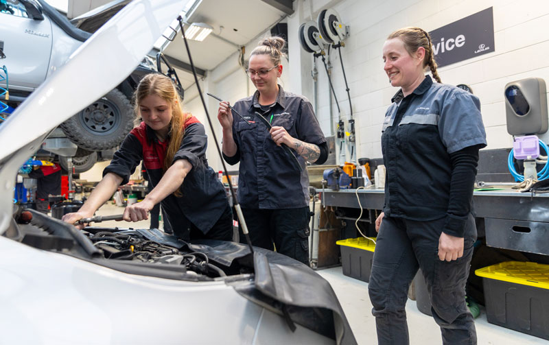 Automotive technicians Violet Farrell, Mikayla Denston, and Bobbie Glasier all began their studies with Otago Polytechnic's Automotive Engineering programmes, and are now thriving in the industry.