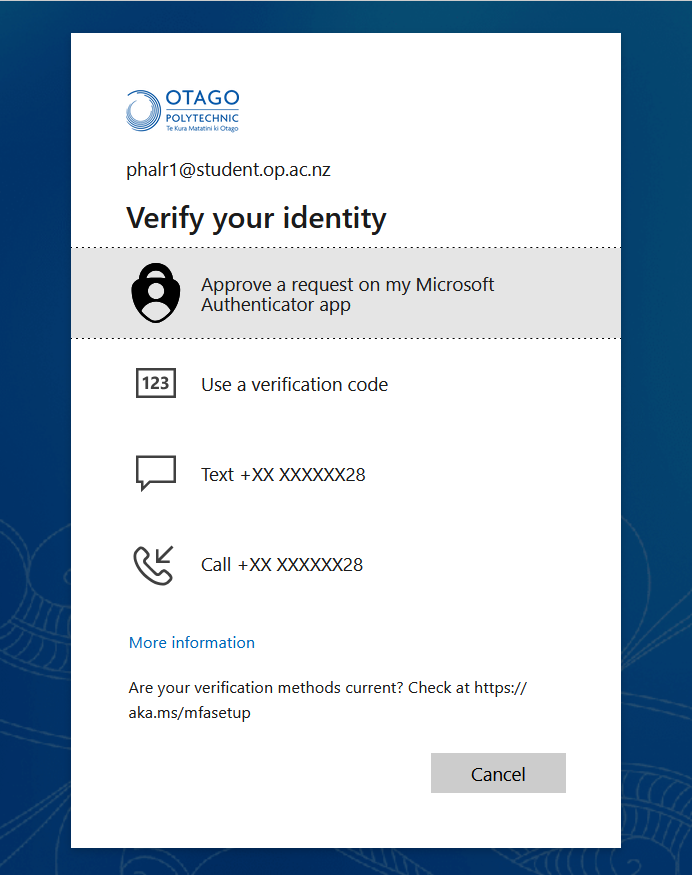 Here are some examples of what you'll see from Monday onwards when you're prompted for multifactor authentication. Just follow the prompts for your chosen method.